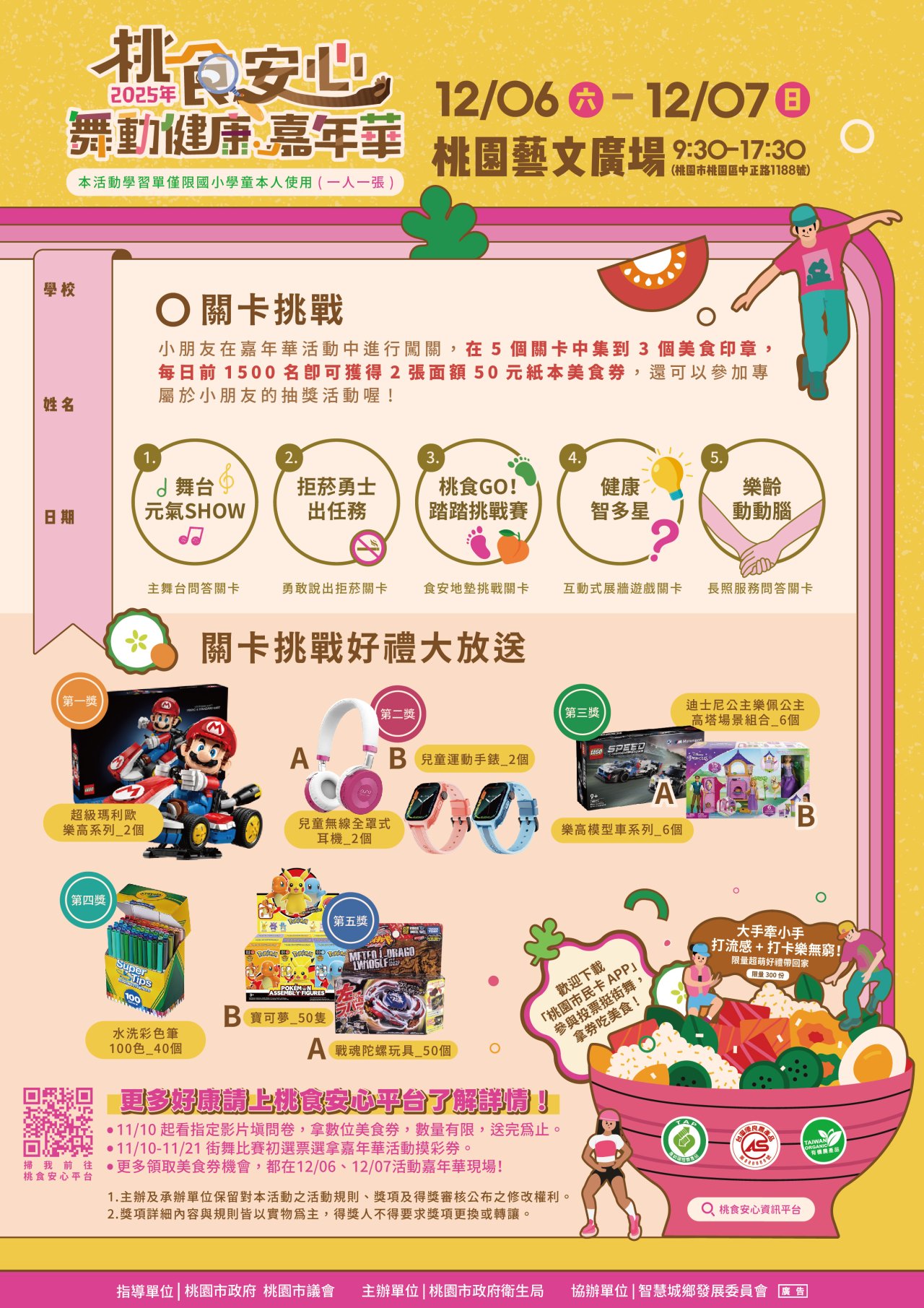 | 三、 | 本活動自 114 年 11 月 10 日起於桃食安心資訊平台另有獲得美食券及摸彩劵之活動訊息,即「看影片,填問卷」和「街舞比賽初賽票選」等,歡迎鼓勵學童與家長共襄盛舉。 |